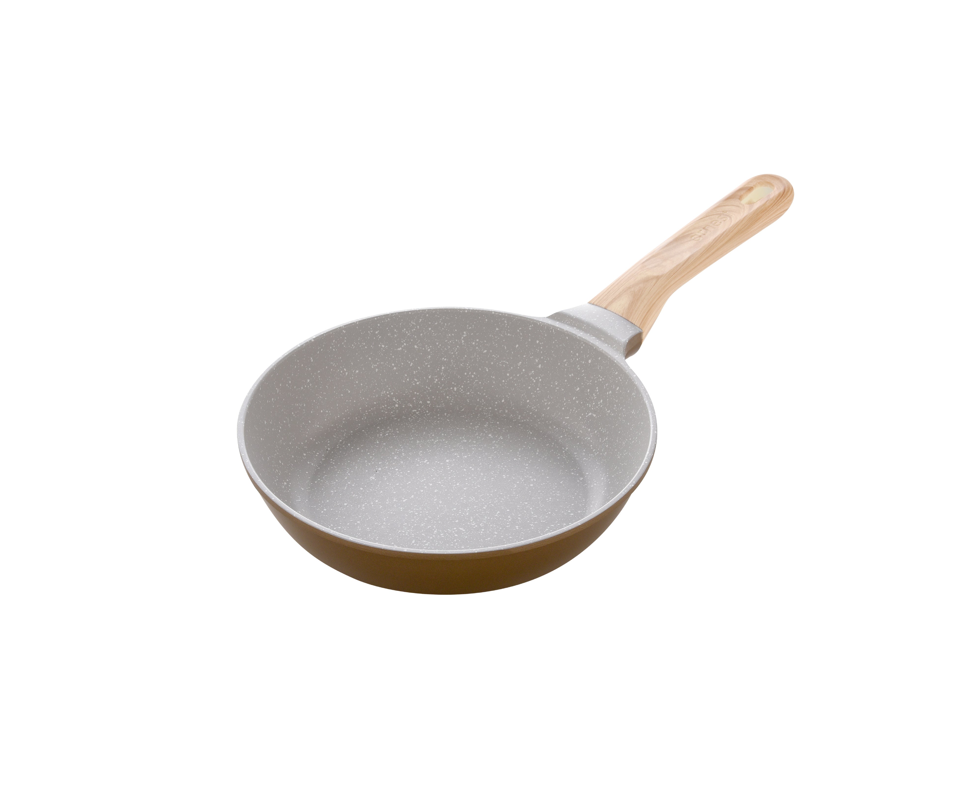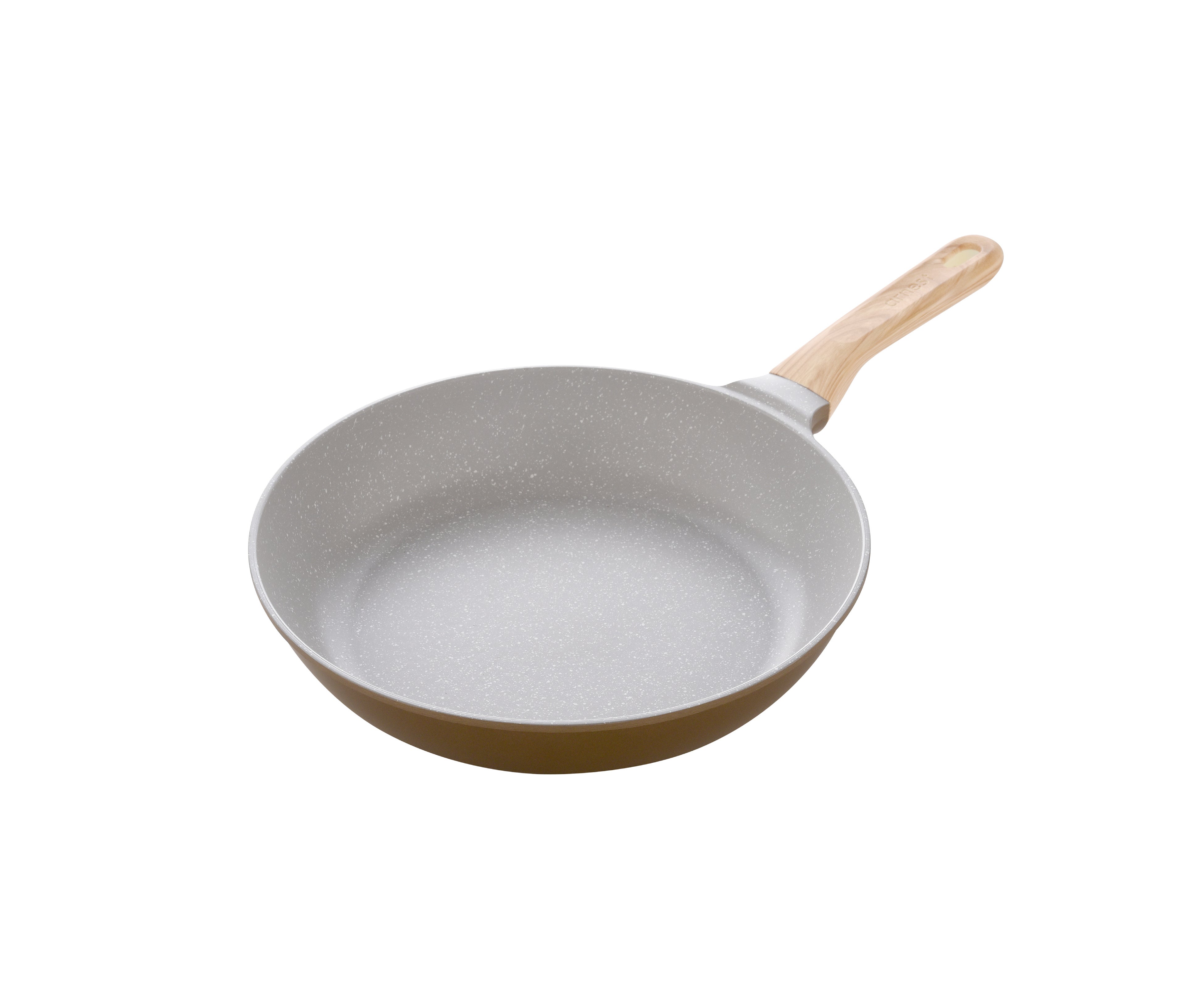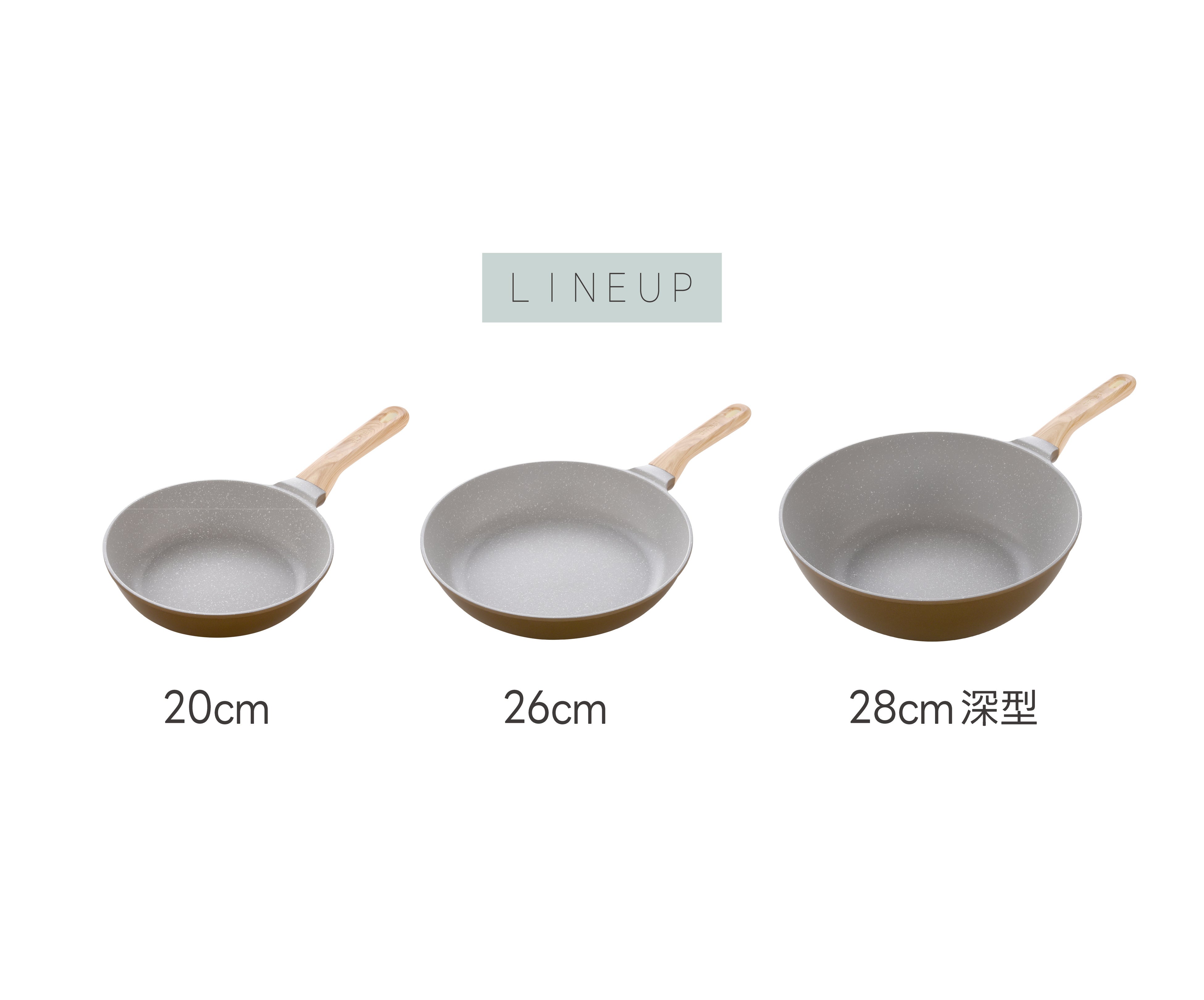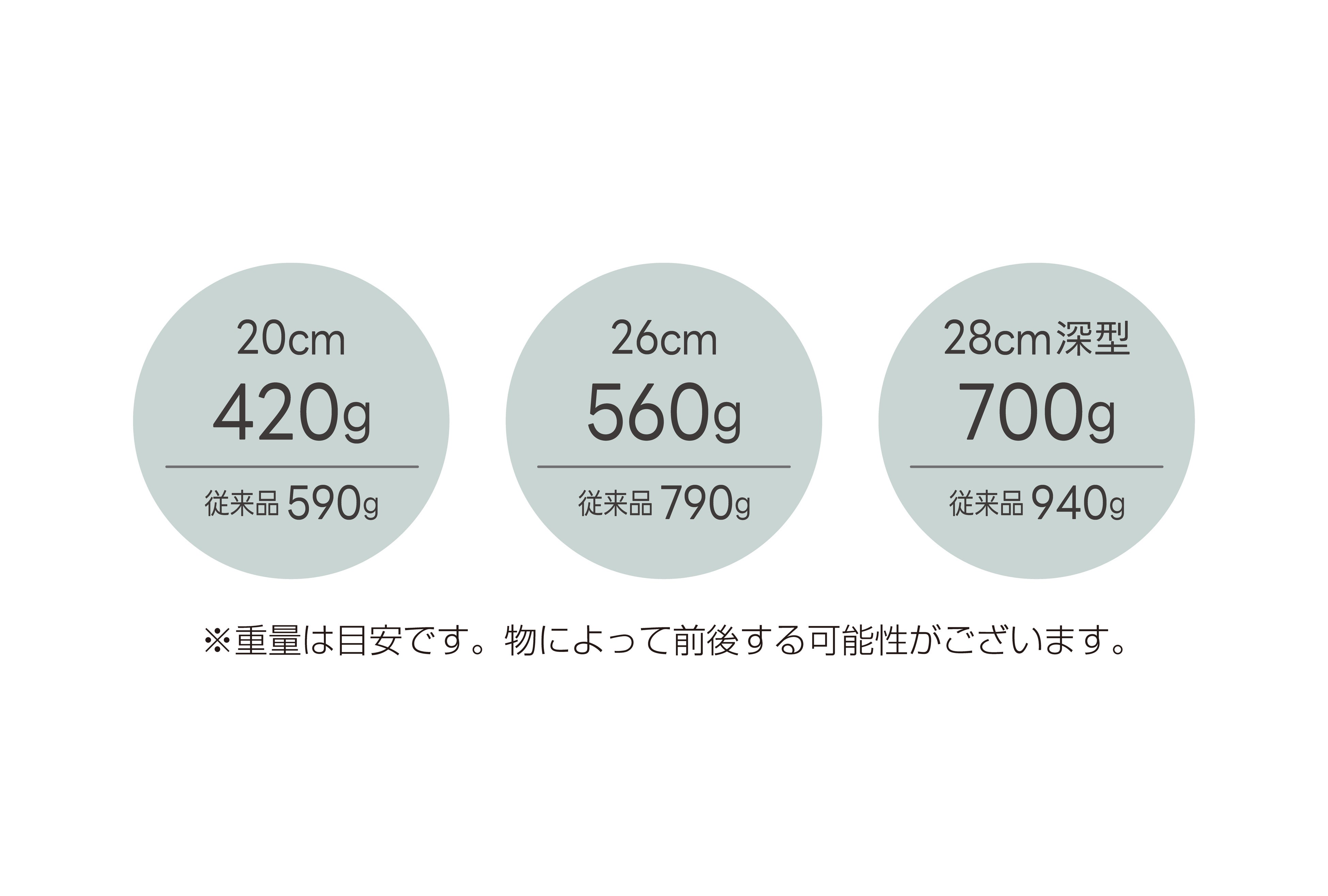 20cm、26cm、28cm 深型の3サイズ展開。軽さだけではなく、ふっ素コーティング(PFOA・PFOSフリー)で食材もこびり付きにくく、底面の蓄熱ステンレスプレートで熱ムラも少ない、使いやすさバツグンのフライパンです。