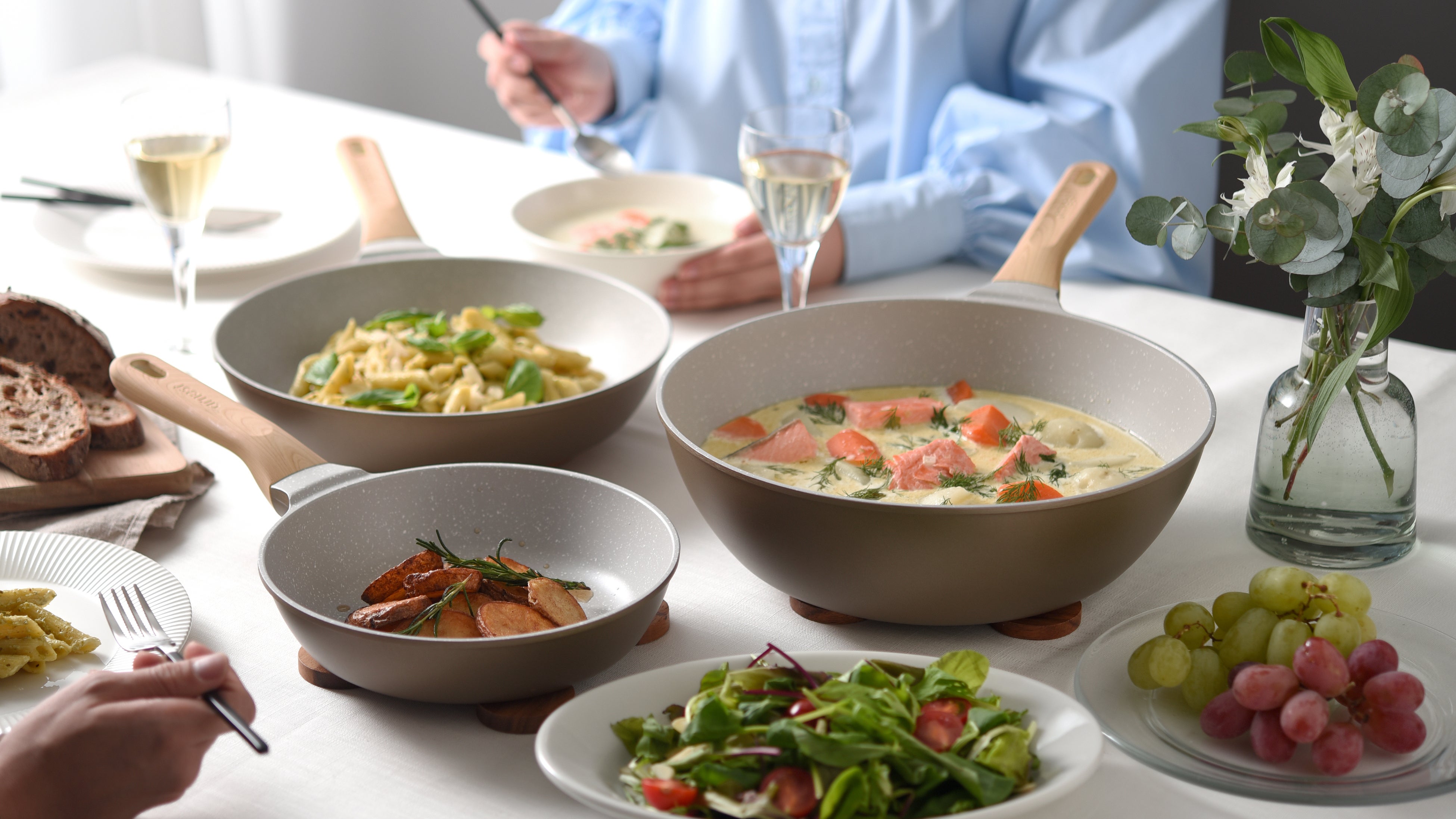 「ベルフィーナ」や「センターエッグトリプルパン」シリーズをはじめ、累計1000 万個以上のフライパンを販売してきたアーネストから『軽さ』と『デザイン性』を追求した新しいフライパンシリーズが登場。