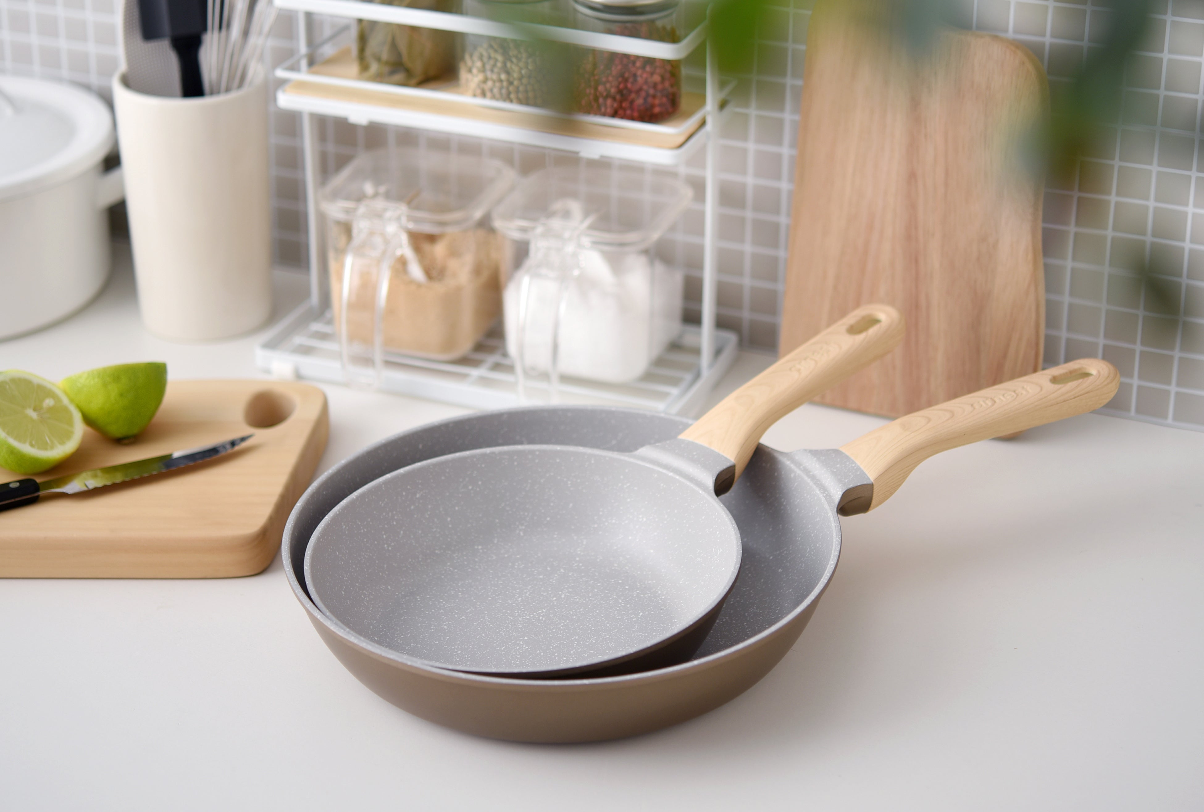 内側は大理石調のグレー、外側はザラッとした質感のゴールドに仕上げ、ナチュラルでありながら落ち着いた印象に。ハンドルはウッドテクスチャの樹脂製で、やさしい風合いと日常使いに耐える丈夫さを両立しています。