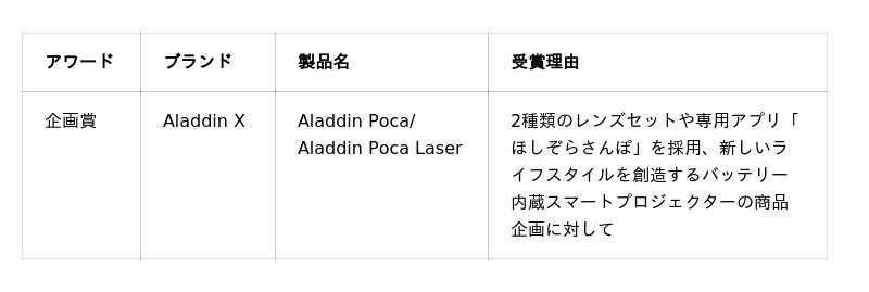 今回の特別賞「企画賞」の受賞は『2種類のレンズセットや専用アプリ「ほしぞらさんぽ」を採用し、新しいライフスタイルを創造するバッテリー内蔵スマートプロジェクターの商品企画』が高く評価されたものです。