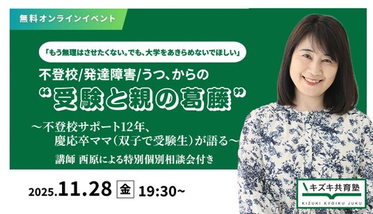 2025年11月28日(金)、不登校/発達障害/うつからの受験サポート15年、卒業生1万4000人超のキズキ共育塾(※)は、無料オンライン講演「不登校、発達障害、うつからの受験と親の葛藤」を開催します。(※不登校オンラインと同じく、株式会社キズキが運営)