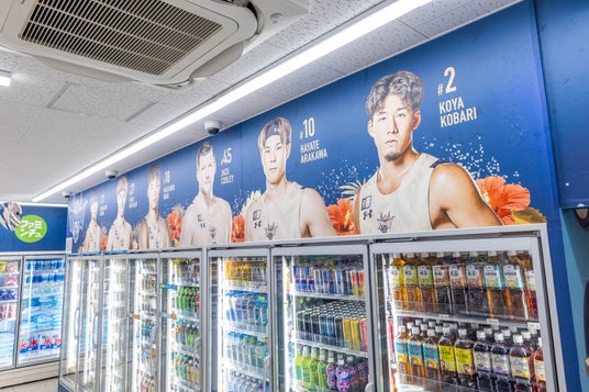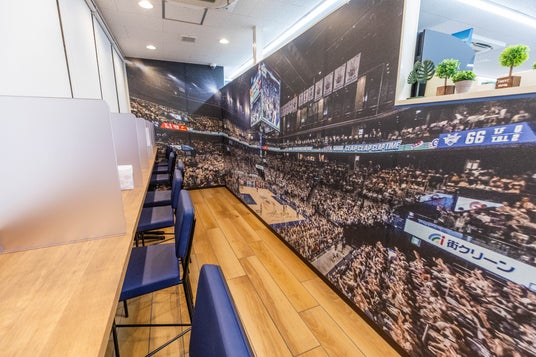 ・コザ運動公園店のイートインスペースには、ホームゲームさながらの熱気と迫力を感じられるビジュアルを配置。まるでアリーナにいるかのような高揚感を、ホームゲームがない日でも味わえる“キングスマートならではの空間”に仕上げています。