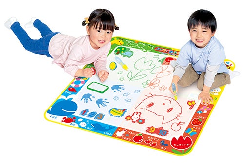 お水のペンで描くため、周囲や衣服を汚さず、のびのびおえかきが楽しめます。描いた絵は乾くと消えるので繰り返し遊べ、シートは畳んでコンパクトに収納可能です。手がた遊びから文字書き練習まで、年齢に合わせて長く使えます。