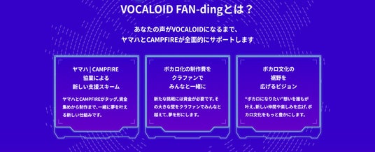 この度CAMPFIREとヤマハは協業し、ボイスバンク、イラスト、デモソングに関わる資金調達、制作業務及びボカロPなどとのマッチングや返礼品の製造梱包発送に至るまで、ボカロ化に必要な多岐にわたる業務を一貫して支援する、新サービス「VOCALOID FAN-ding」を立ち上げました。この活動を通して、“ボカロになりたい”という想いを抱くキャラクターIP事業者と、その夢への挑戦を応援したい「ファン(FAN)」の想いを繋ぎ、ボカロ文化が好きで集まってきている皆様と共にボカロの未来を育んでいきます。