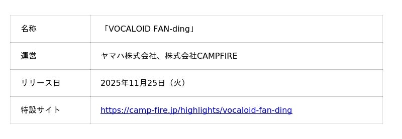 国内最大級のクラウドファンディングプラットフォーム「CAMPFIRE」を運営する株式会社CAMPFIRE(本社:東京都渋谷区、代表取締役:中島真)はヤマハ株式会社(以下、ヤマハ)と、11月25日(火)からボカロに“なりたい”から“なれる”を支援するクラウドファンディング型ボカロ化支援サービス「VOCALOID FAN-ding」を開始します。