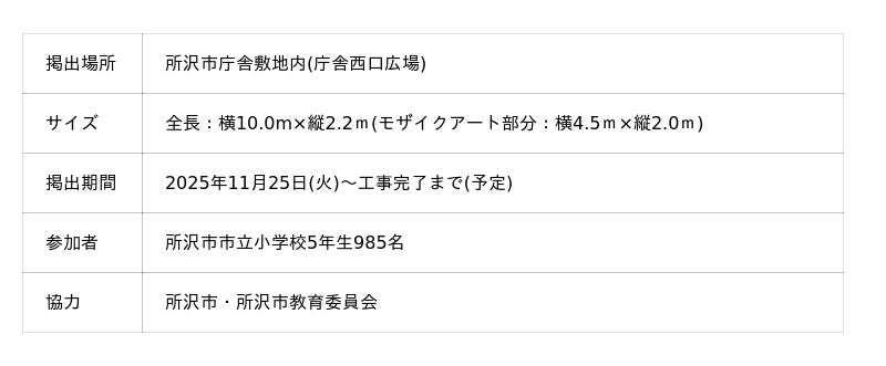 正和・貫井・糟谷特定建設工事共同企業体(代表構成員:正和工業株式会社、本社:埼玉県春日部市、代表取締役:横田生樹、以下、JV)は現在進行中の所沢市庁舎基幹設備改修工事において、地域活性化の取り組みとして「まちを笑顔にプロジェクト第2弾」を実施。2025年11月25日(火)より、市庁舎敷地内に巨大モザイクアートを掲出しました。今回は所沢市のシンボルである飛行機をモチーフとした巨大モザイクアートで、市内の市立小学校5年生、およそ1000人が授業中に描いた絵画をもとに構成しました。