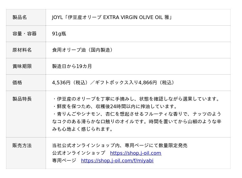 JOYL「伊豆産オリーブ EXTRA VIRGIN OLIVE OIL 雅」を12月1日(月曜日)より当社公式オンラインショップにて数量限定で販売を開始します。