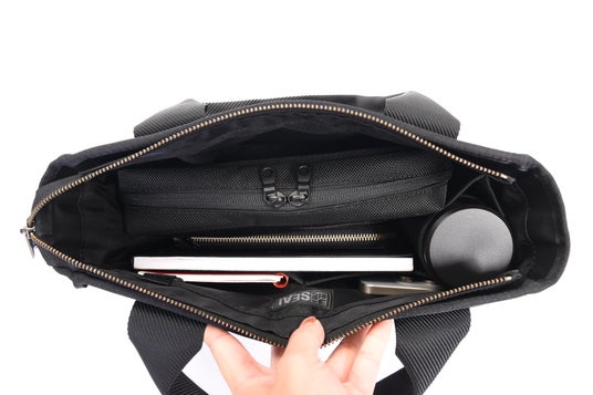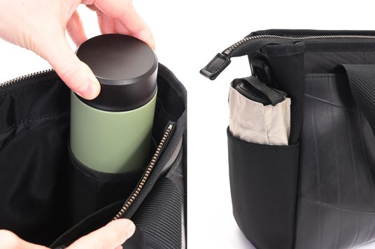 メイン収納は、しっかりとマチを取ることで見た目以上の大容量を実現。ファスナー開閉仕様のため、移動時でも中身が見えにくく、セキュリティ面でも安心です。背面にはサッと出し入れできるボタンポケット、両サイドにはスマートフォンや折りたたみ傘の収納に便利なサイドポケットを配置しました。内装にはボトル専用ポケットやオープンポケットなど複数のポケットを備え、荷物が増えても整理しやすい構造となっています。