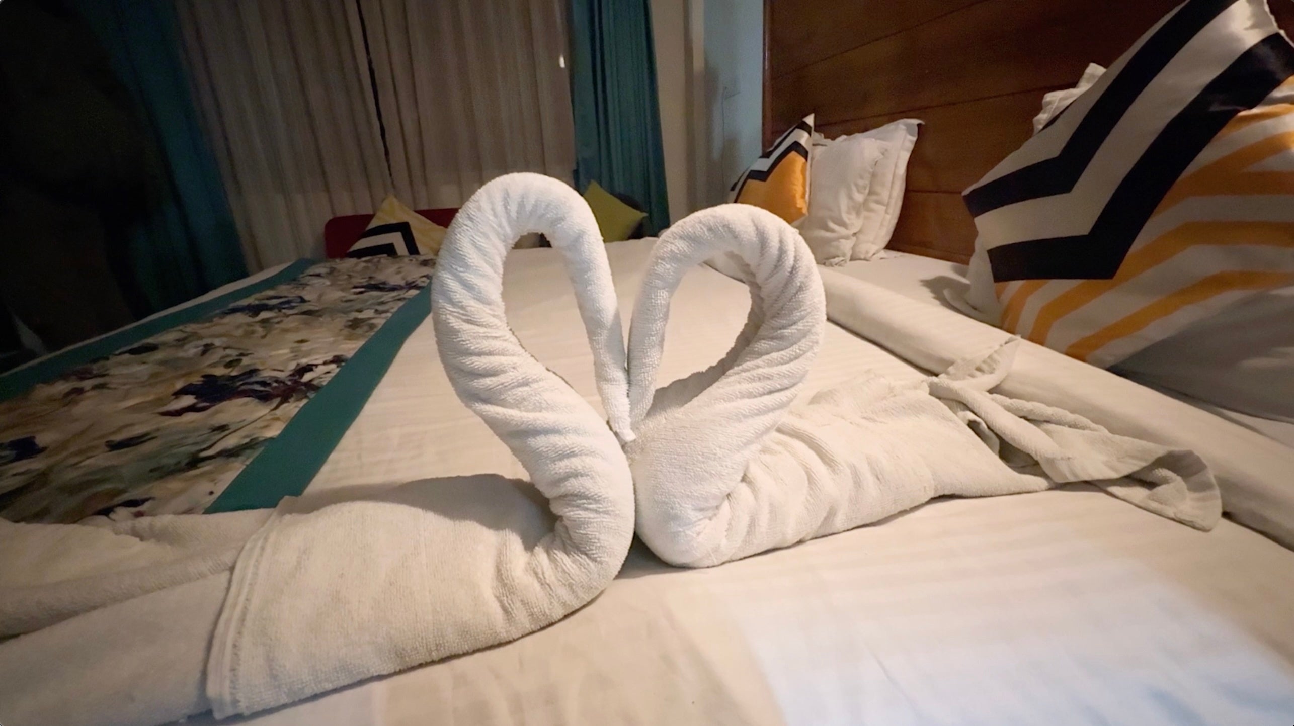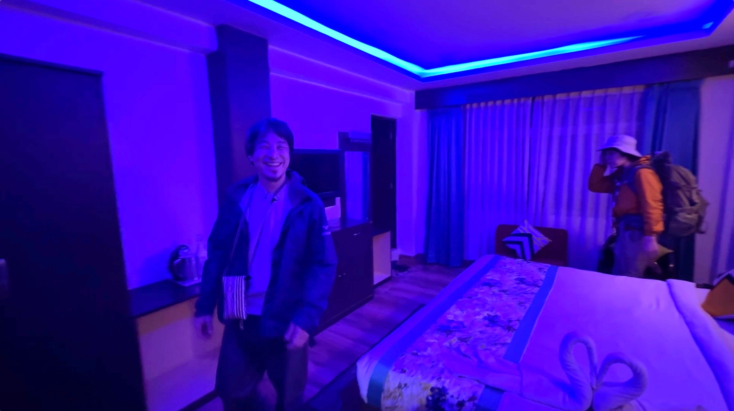 アモールさんの家に泊めてもらうあてが外れたくるまとひろゆきは、急遽ホテルを探すことに。ホテルを探す中、たまたま出くわしたホテルオーナーから「うちのホテルなら部屋がある」「2人で1部屋」と、ホテルの部屋に案内された2人でしたが、部屋にはダブルベッドが1つのみ、ベッドの上にはハート型に作られた白鳥のタオルアートが置かれており、くるまは「(ベッド)分けてほしいですよね?」「タオルの白鳥がチューしてますよ」と動揺します。一方、ひろゆきは「別にいいですよ」「僕は全然大丈夫ですよ」と平然。怪しい光に包まれるムード満点な部屋のライトにくるまは「ラブホっぽくないですか?」と、ひろゆきも「これはエロいことをする用の部屋なんですか?」と漏らしたものの、2人はこの部屋に宿泊を決めました。