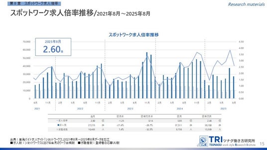 2025年8月度のスポットワーク求人倍率は2.60倍となり、前月で1.25ポイント低下。前年同月では0.14ポイント上昇しました。微増となりましたが、15か月連続で前年同月より上昇しております。
