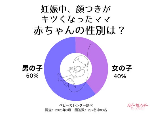 297人を対象におこなったアンケートで、「妊娠中に顔つきがきつくなった(きつくなったと言われた)」と答えたママは83人。そのうち、男の子を出産したのは50人(60%)でした。ジンクス通りの性別の赤ちゃんを産んだママが半分よりもやや多いものの、圧倒的な差があるとは言えない結果です。