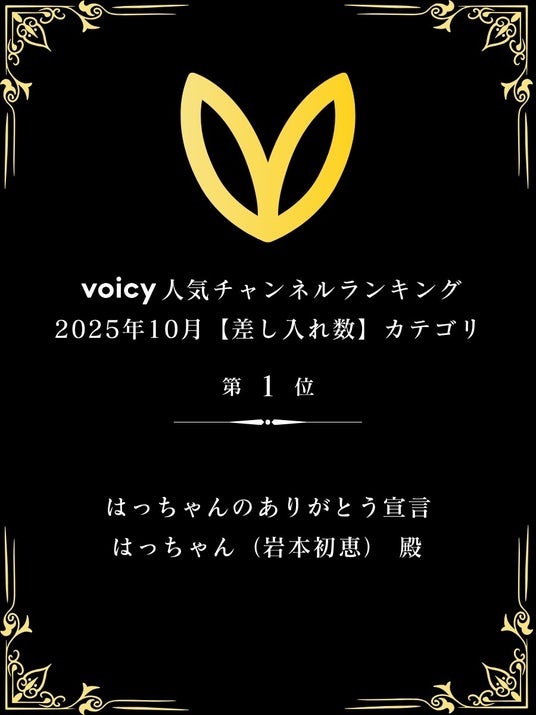 「株式会社愛しとーと」(福岡県那珂川市)の代表・岩本初恵(愛称:はっちゃん)が配信するVoicyチャンネル「はっちゃんのありがとう宣言」が、人気チャンネルランキングの2025年10月度「差し入れランキング」で第1位になりました。これで2024年10月度から13ヵ月連続での1位獲得になります。
