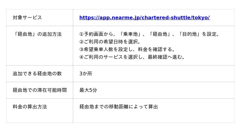 移動に関する課題解決に取り組むソーシャルデザインカンパニーである株式会社NearMe(本社:東京都中央区、代表取締役社長:高原幸一郎、以下「ニアミー」)は、東京23区、浦安市、横浜市などで提供している、最大9名まで利用可能な貸切配車サービス「大型車予約」において、出発地と目的地の間に立ち寄り地点(経由地)を設定できる新機能を本日より提供開始いたします。