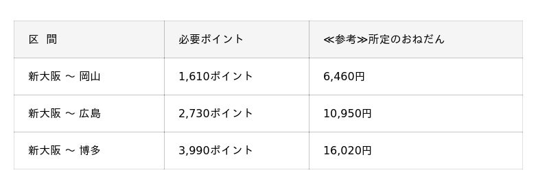 ※のぞみ号を利用したおとな1人あたり(普通車指定席・通常期)の場合の必要ポイント(おねだん)です。