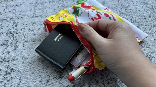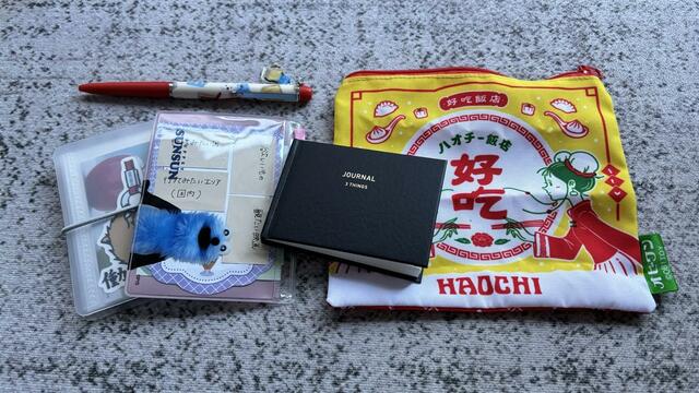 本当に小さな手のひらサイズの日記帳なので、筆者は普段、ボールペン、シール、ふせんと一緒にポーチにまとめて、バッグに入れて持ち歩いています。