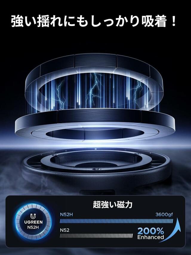それについてはご安心を。「MagSafe 車載スマホホルダー」は、N52H磁石を20個搭載して3600GFの磁力を実現。主にN52などの磁石が搭載されている従来品と比べて、固定力が大幅アップしています!