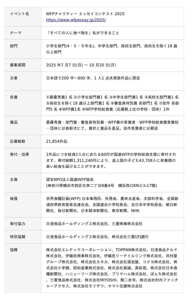 ・入賞作品&受賞者・審査員のコメント:https://www.wfpessay.jp/2025/result.html