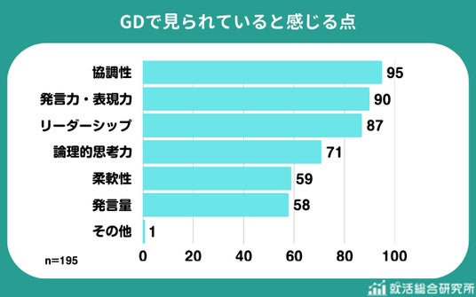 GDで企業から見られていると感じる点として、「協調性」(95人)が最多でした。次いで「発言力・表現力」(90人)、「リーダーシップ」(87人)が挙げられ、議論を進める姿勢や役割遂行力が重視されているとの認識が強いことが明らかになりました。