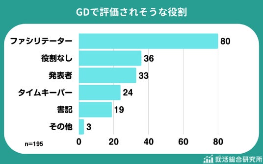 GDで評価されそうだと感じる役割については、「ファシリテーター(司会者)」(80人)が最も多く、議論をまとめ進行を管理する役割が高く評価されると考える就活生が多い結果となりました。