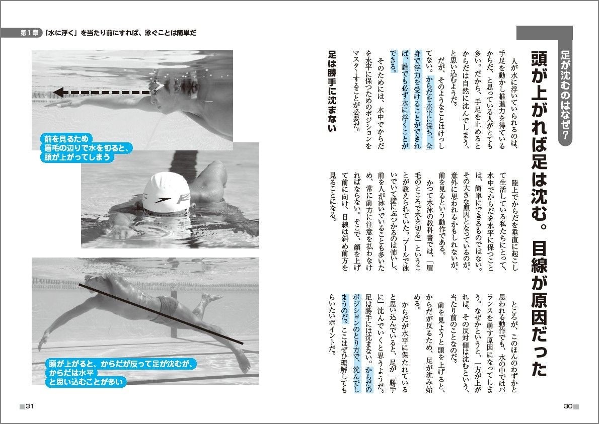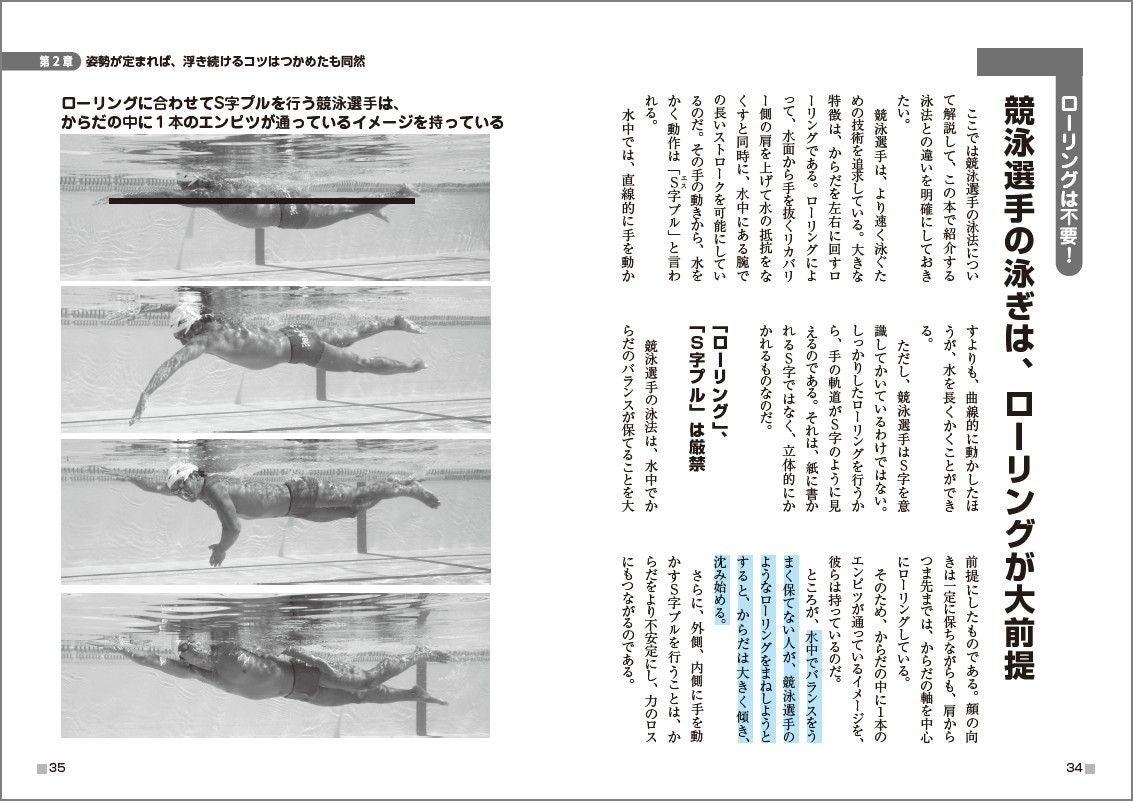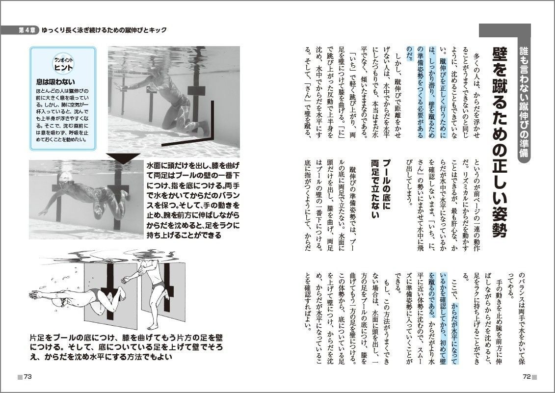 例えば、競泳選手が使うローリングのように難易度の高いテクニックは、納得いく理論のもとに代替法を提案するなど、徹底的に無理なくムダなく、初心者に寄り添った内容になっています。