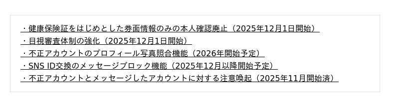 はじめに、12月2日以降に公的書類として原則利用できなくなる健康保険証を含む、券面情報のみで行う本人確認を12月1日に廃止し、本人確認手法を「マイナンバーカードのICチップ読み取り」と「アプリ内の自撮り(セルフィ)と公的書類による認証」の2つに限定します。その他「目視審査体制の強化」「不正アカウントのプロフィール写真照合機能」「SNS ID交換のメッセージブロック機能」「不正アカウントとメッセージしたアカウントに対する注意喚起」を、2025年11月から順次開始します。