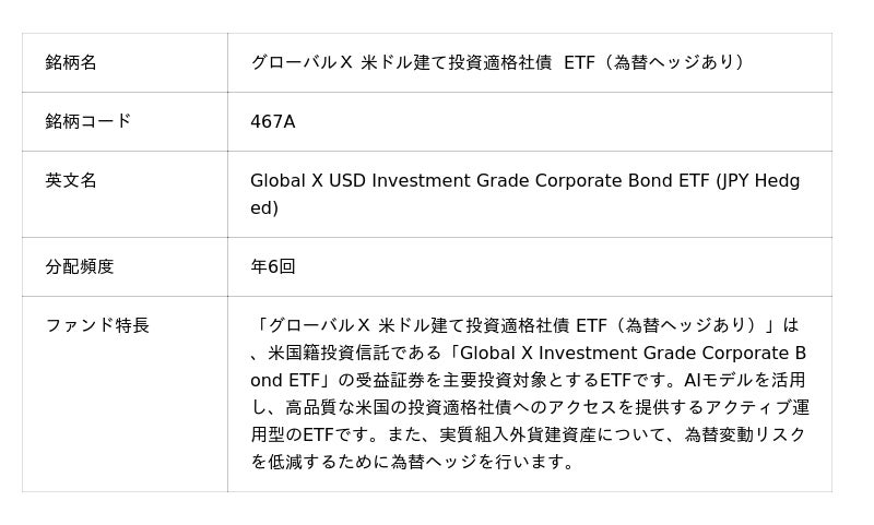 「グローバルX 米ドル建て投資適格社債 ETF(為替ヘッジあり)」【467A】