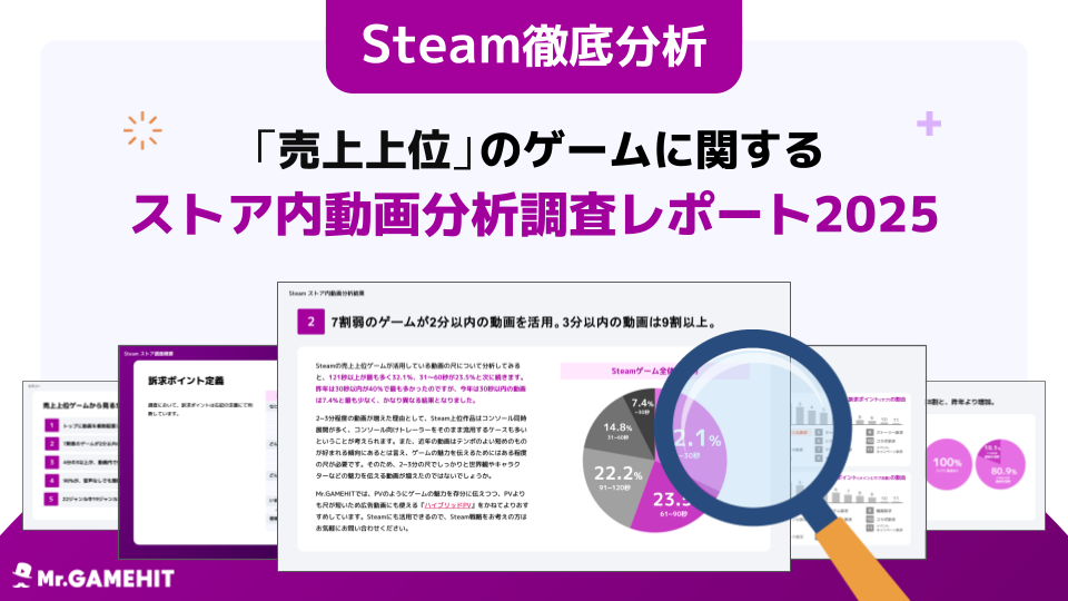 ゲーム業界に特化した動画制作・広告運用サービス「Mr.GAMEHIT(ミスターゲームヒット)」(https://mrgamehit.com/)を提供する株式会社メイラボ(本社:東京都港区、代表取締役:佐藤 真一)は、この度、『Steam 売上上位のゲームに関するストア内動画分析調査レポート2025』を無料公開いたしました。