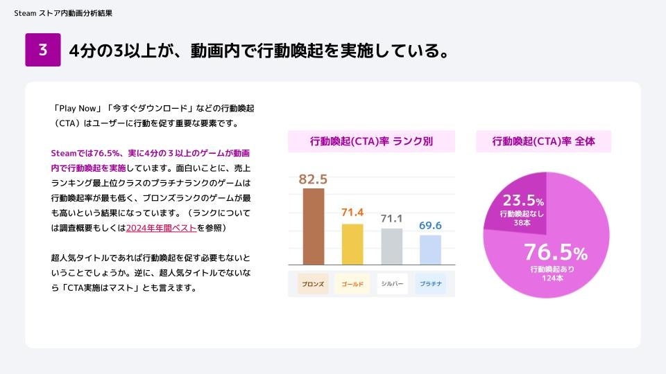「Play Now」「今すぐダウンロード」などの行動喚起(CTA)はユーザーに行動を促す重要な要素です。Steamでは76.5%、実に4分の3以上のゲームが動画内で行動喚起を実施しています。面白いことに、売上ランキング最上位クラスのプラチナランクのゲームは行動喚起率が最も低く、ブロンズランクのゲームが最も高いという結果になっています。