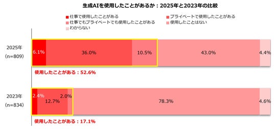 2.生成AIを使用したことがあるか:2025年と2023年の比較