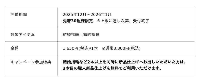 株式会社一宝(所在地:北海道札幌市)が運営する、ジュエリー修理・リフォーム・リペア専門店「RITZ GLANDE(リッツグランデ)」は、結婚指輪・婚約指輪に特化した「職人新品仕上げ半額キャンペーン」を2025年12月~2026年1月の2か月間、先着30名様限定で実施いたします。