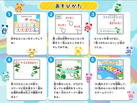色が失われた世界に入り込んでしまった友達“みらいーな”を救うため、主人公ルンルンが世界を旅して色を取り戻していくゲームです。10のステージから好きな色を選び、ルンルンと同じ10種の色を見つけてオブジェクトを塗っていくとゲームクリア。タイムアタック機能もあり、何度でも楽しめる仕様になっています。