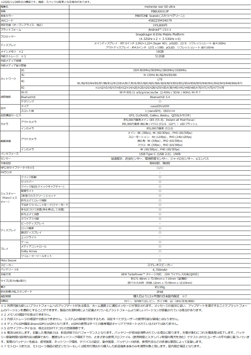 モトローラ・モビリティ・ジャパン合同会社(本社:東京 代表取締役社長 北原 秀文、以下、「モトローラ」)は、Android(TM) スマートフォン「motorola razr 60 ultra」を12月に販売開始いたします。