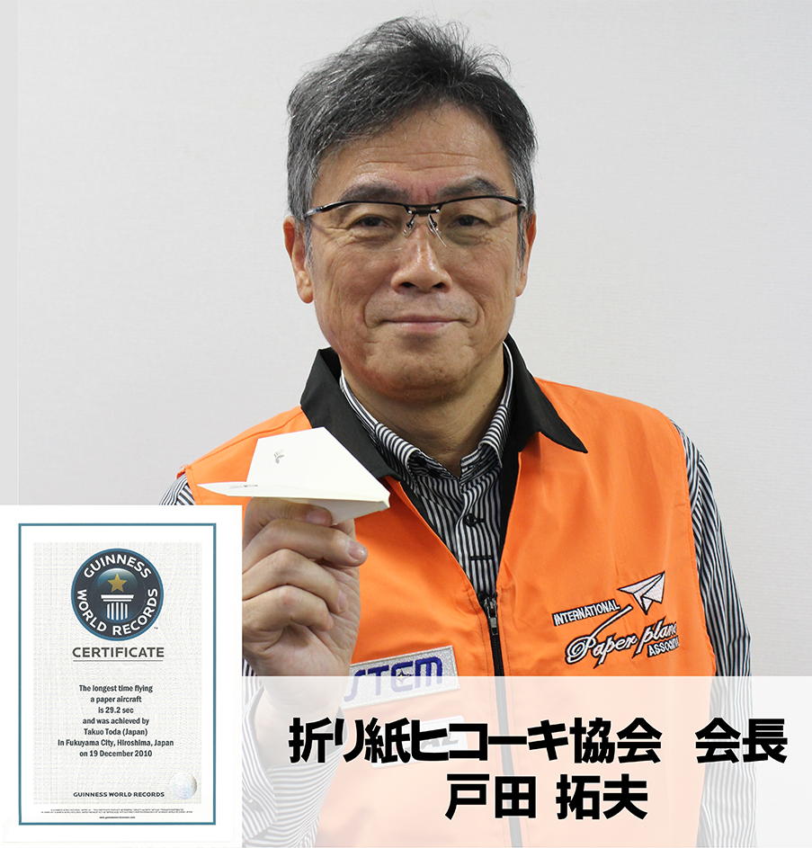 折り紙ヒコーキ協会の戸田拓夫会長は、大学時代に折り紙ヒコーキを始めました。ギネス世界記録の存在を知ってから8年もの間練習に明け暮れ、2009年、ついに紙ヒコーキ室内滞空時間で27.9秒のギネス世界記録を達成。その翌年の2010年12月19日に29.2秒を打ち出し、自身の記録を更新しました。