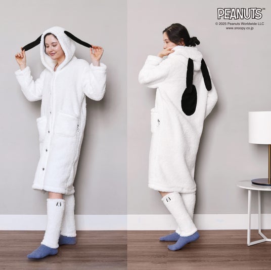 ふわふわあたたかな肌ざわりのシープボア素材の着る毛布。肌寒い時にさっとはおれてお家時間を快適に。フード部分に付いた耳や、ポケットからのぞき見しているスヌーピーのワッペンがポイントです。ウォッシャブル仕様で清潔にご使用いただけます。