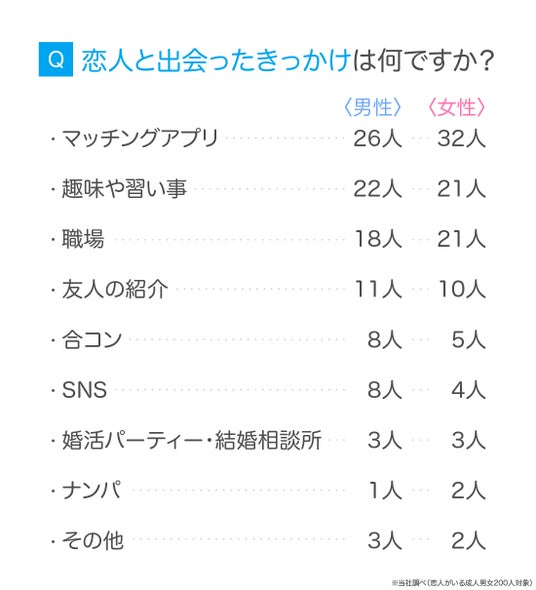 恋人がいる成人男女200人に、恋人と出会ったきっかけを尋ねたところ、最も多かったのは「マッチングアプリ」でした。
