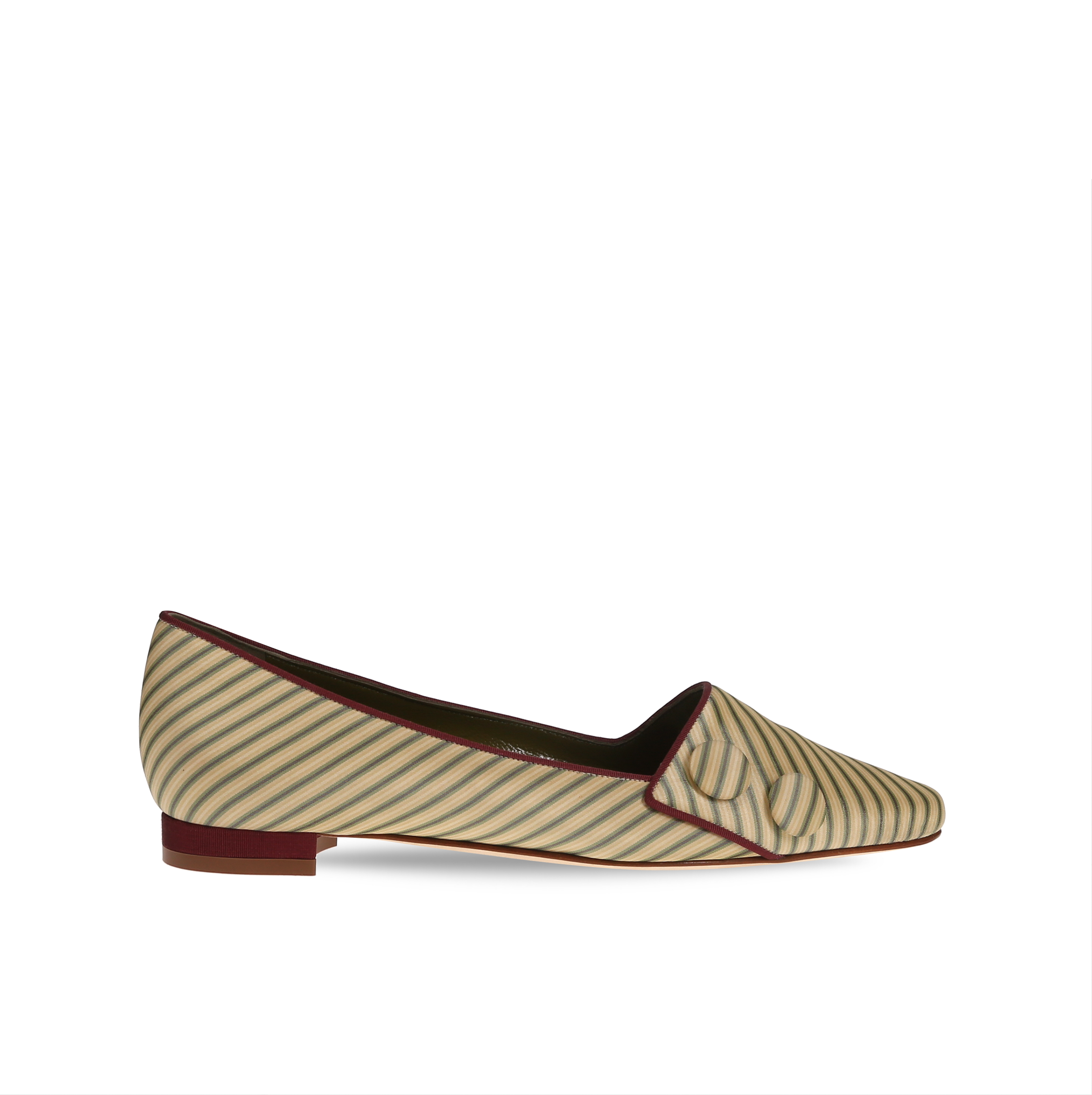 今回、これまで発表されたカプセルコレクションの全ラインナップが一堂に揃います。さらに、ポップアップからローンチされる新作として、フランス貴族の姓にちなんで名づけられた「FONTENABLAS/フォンテネブラ」と「FONTENAI/フォンテネ」が登場。ストライプ模様に大きなくるみボタンをあしらったデザインは、クラシカルなエレガンスの中に遊び心を感じさせる一足です。