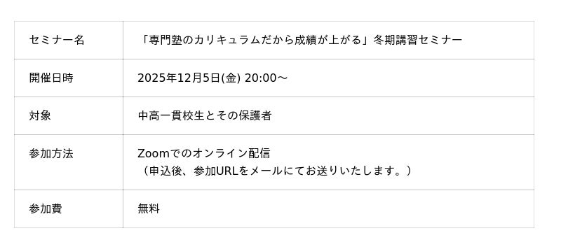 中高一貫校専門 個別指導塾WAYS(運営:株式会社メイツ、本社:東京都新宿区)は、中高一貫校に通う中学生・高校生とその保護者を対象として無料オンラインセミナー『専門塾のカリキュラムだから成績が上がる冬期講習セミナー』を2025年12月5日(金)の20時より開催いたします。本セミナーでは、指導経験豊富なプロ講師が、成績が伸び悩む原因となりがちな「冬休みの過ごし方」にメスを入れ、この冬に取り組むべき具体的な学習ロードマップを提示します。