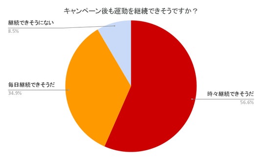 「キャンペーン後も運動を継続できそうですか?」(回答数106)では、「毎日継続できそうだ」が34.9%で3分の1以上を占め、「時々継続できそうだ」(56.6%)とあわせると91.5%が、キャンペーンを契機に運動を続けたい意向であることが分かりました。「外出してなるべく歩くようになった」との回答が複数あったほか、「ジムに通い始めた」「『日の出ウォーキング』を再開した」などの記述もありました。