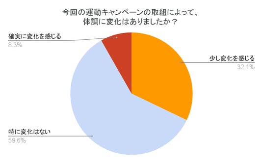 そのなかで「今回の運動キャンペーンの取組によって、体調に変化はありましたか?」(原文まま。回答数109)の質問に「確実に変化を感じる」(8.3%)、「少し変化を感じる」(32.1%)を合わせた回答が40.4%ありました。具体的な変化としては、複数が「体重の減少」「肩こりの軽減」「体力がついた」を挙げました。なかには「頭痛が解消した」参加者もいました。