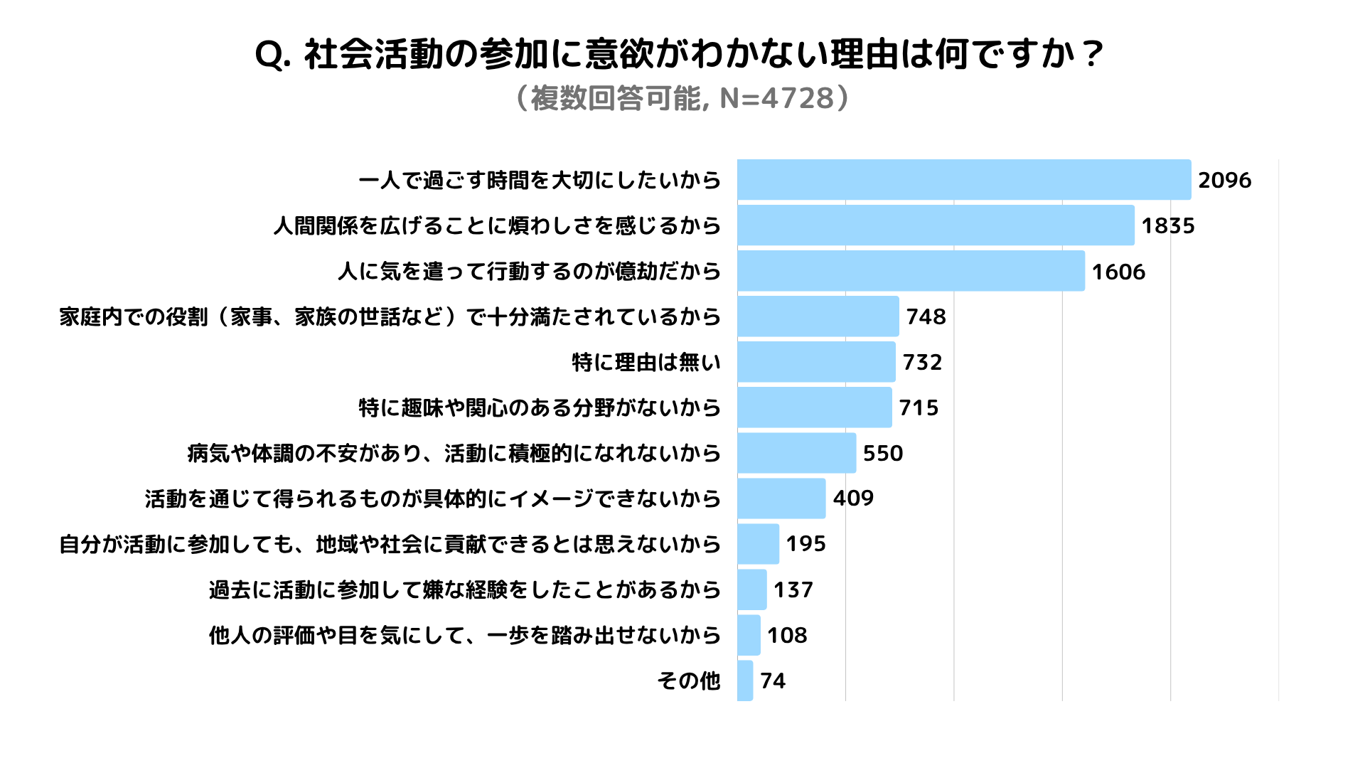 社会活動への参加意欲がわかない理由として、回答者が強く意識しているのは 人間関係に関する負担 と 個人的な時間配分 の問題でした。