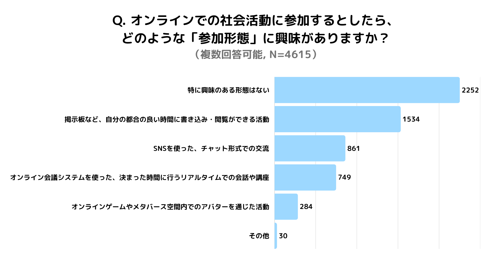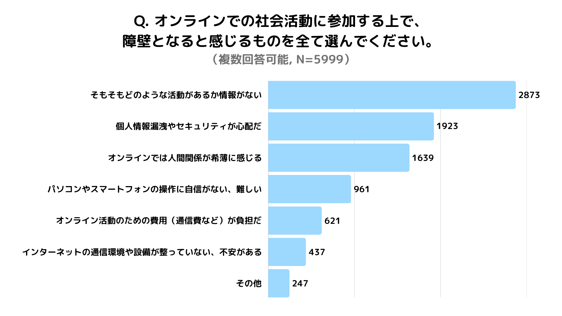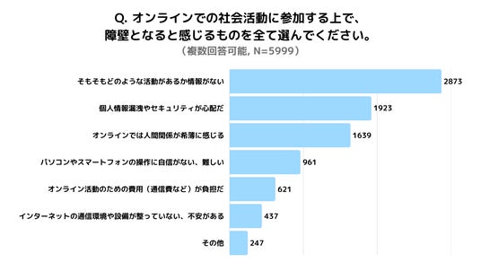 オンライン活動の障壁として最も多かったのは、圧倒的に「どのような活動があるかわからない」(2,873件)でした。