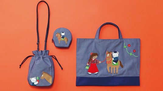 ショルダーバッグは、馬具を外した馬がおやつタイムを楽しむワンシーンを描いています。クマちゃんも和装から着替えてにんじんをあげている楽しそうな様子を表現しました。