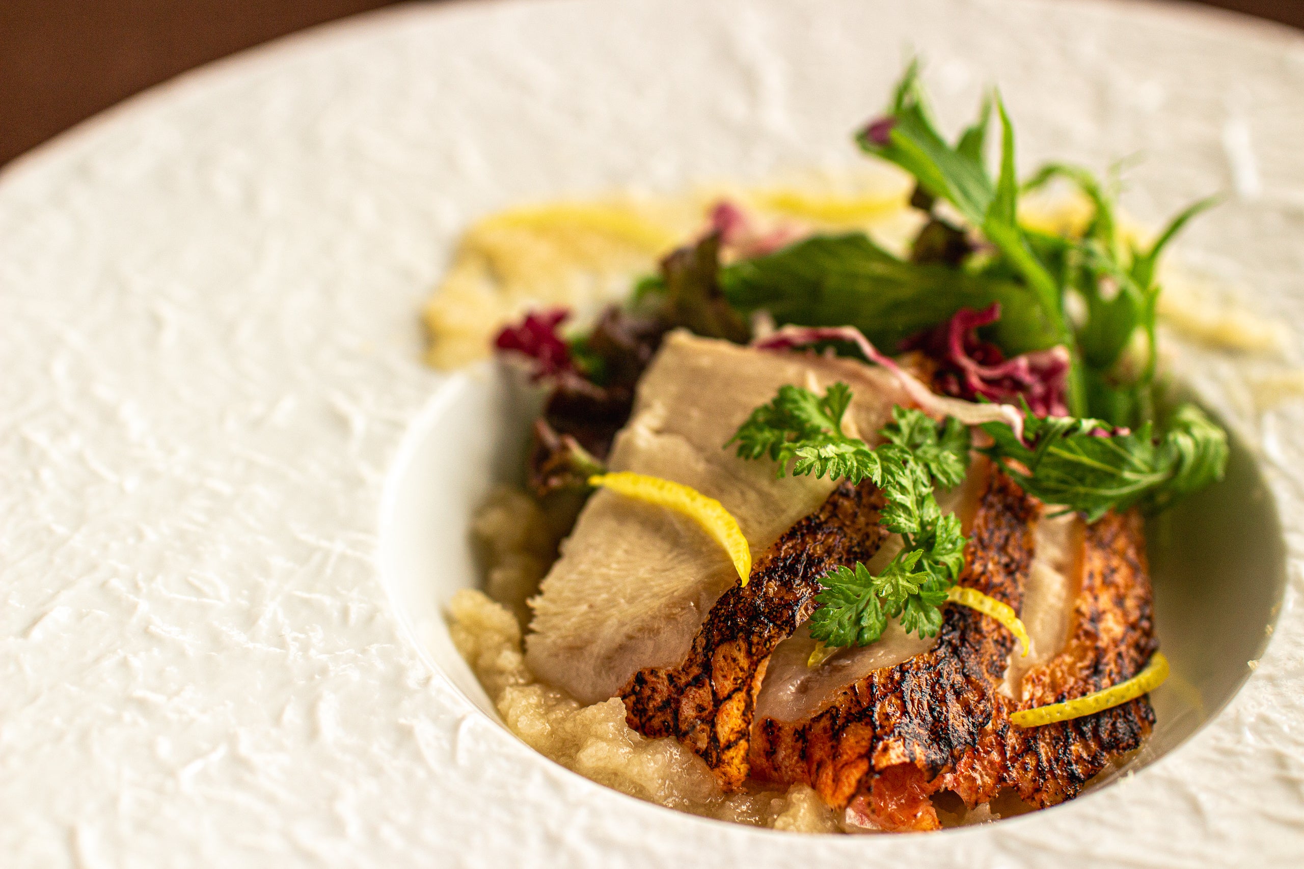 前菜:金目鯛の炙り 蒜山大根のジュレ 白ポルト酒のソース ハーブと柑橘の香り