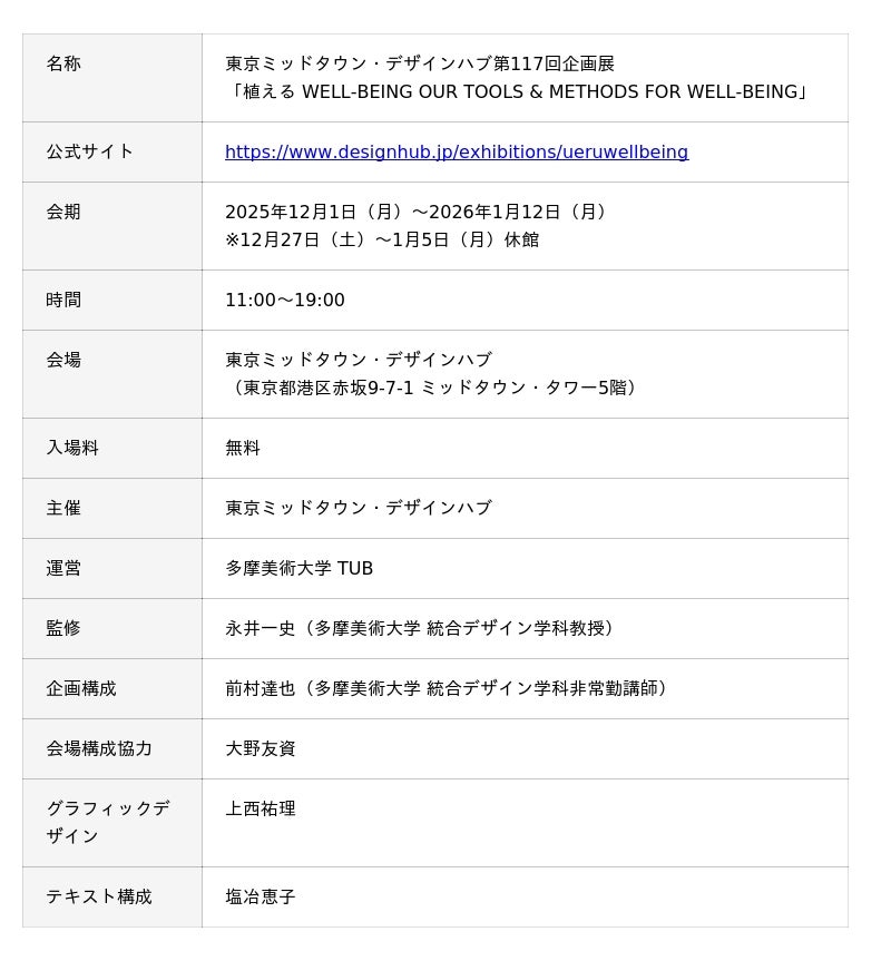 学校法人多摩美術大学(所在地:東京都世田谷区、理事長:青柳正規、多摩美術大学学長:内藤廣)は、東京ミッドタウン・デザインハブにて第117回企画展「植える WELL-BEING OUR TOOLS & METHODS FOR WELL-BEING」を12月1日より開催いたします。