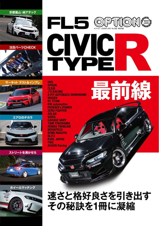 現行モデルのスポーツカーで、群を抜いてチューニング人気が高いのがFL5シビックタイプRだ。そこで、今月のオプションでは48ページの小冊子でFL5を大特集。メーカー&ショップが手掛けたデモカーの詳細チェックはもちろん、サーキットやワインディングでの比較テスト、最新パーツやドレスアップ手法の情報、ホイールマッチングなど、内容盛り沢山でお届けだ!