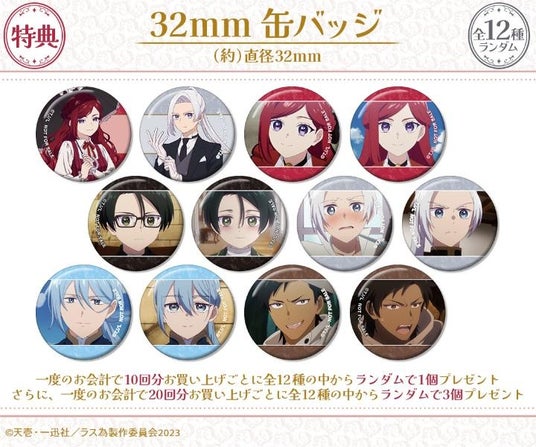 一度のお会計で10回分ご購入ごとに特典32mm缶バッジ(全12種)の中からランダムで1個、20回分ご購入ごとにランダムで3個プレゼント!