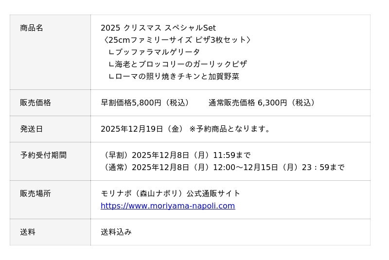 冷凍ピザ等の製造・販売をおこなう株式会社森山ナポリ(石川県金沢市)が手掛けるブランド「モリナポ」では、クリスマスシーズン限定の特別商品「2025 クリスマス スペシャルSet」の予約販売を、モリナポ公式通販サイトにて開始いたしました。今年もシチュエーションに応じて選べる2種類をご用意。少人数でも楽しめる定番21cmのピザ4枚セットと、ボリューム感のあるファミリーサイズ25cmのピザ3枚セットからお選びいただけます。いずれもモリナポ公式通販サイト限定の特別セットです。