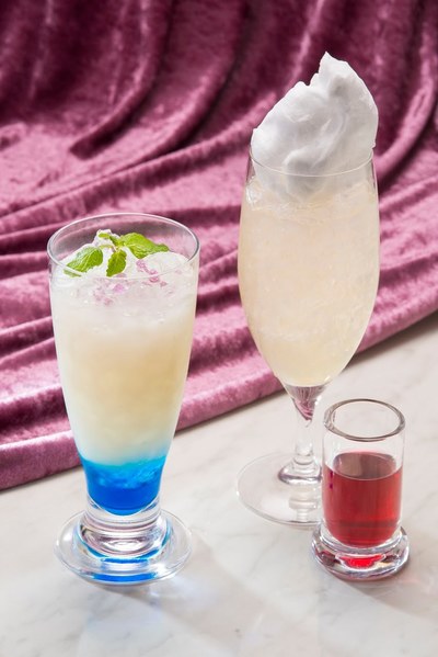 エルサをイメージしたエレガント・エルサ(写真左)は、カルピス、ピーチネクター、ブルーシロップのカクテル、