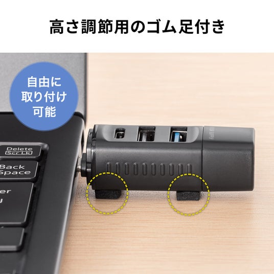 底面には高さ調節用のゴム足が付属しており、設置するPCの高さに合わせて貼り付けることで、見た目も操作感もスマートに調整できます。また、PCやタブレットからの取り外しがしやすいように、側面に凹凸がついています。小さい筐体に使いやすさを意識した特徴も詰め込められているUSBハブです。