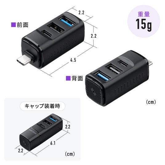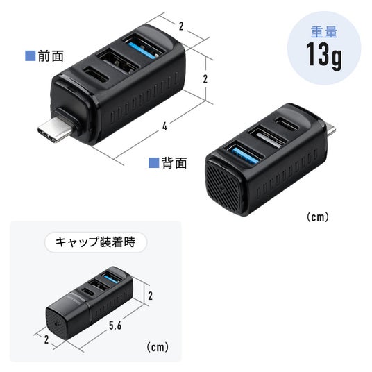 USBハブ コンパクト 小型 USB Type-C接続 USB3.0 USB2.0 バスパワー USB-Cポート USB Aポート 3ポート コンボハブ 黒色 軽量